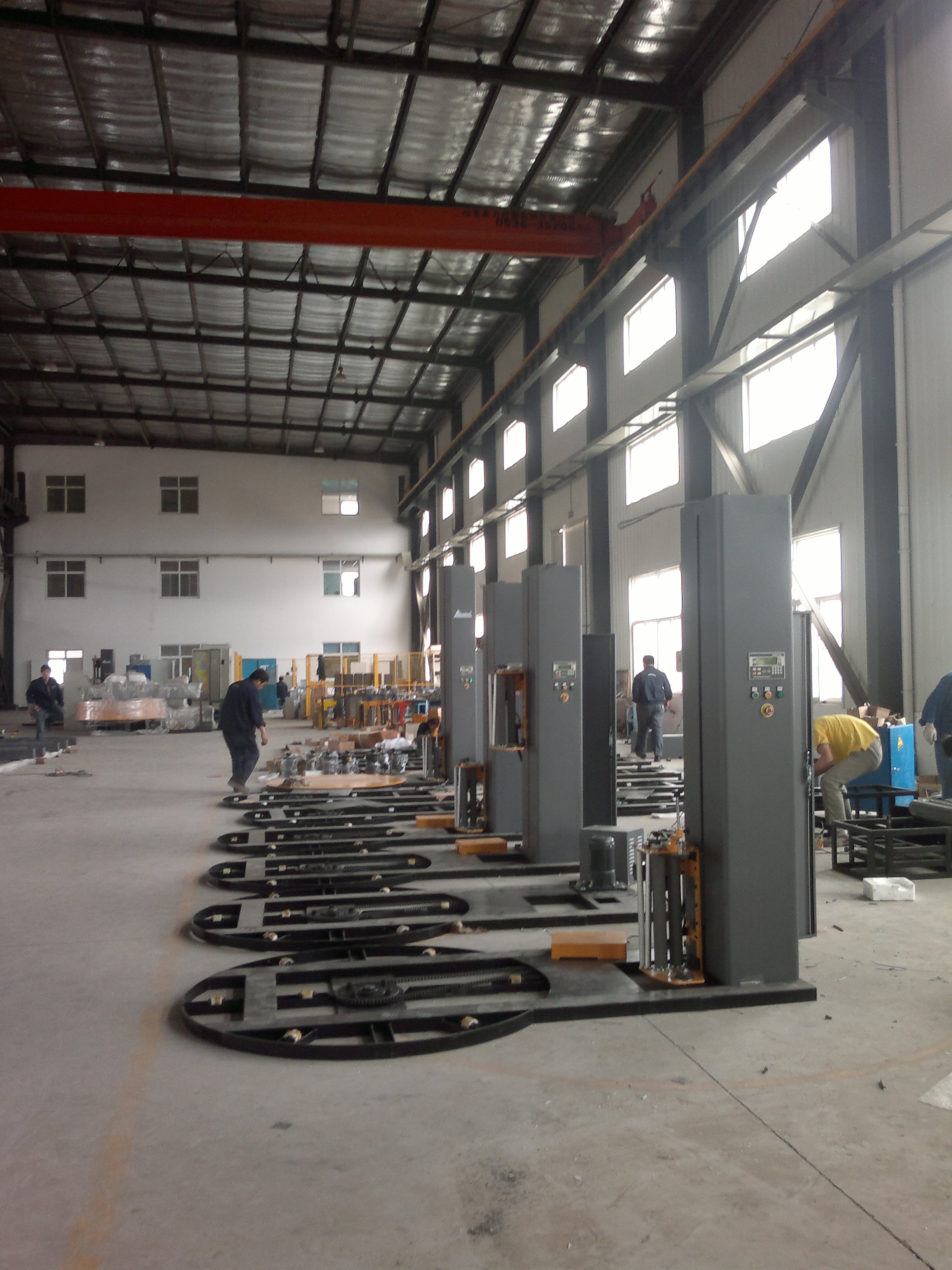 拉伸膜纏繞機的使用步驟 1.機器處于初始位置,將薄膜固定在轉盤或貨物上,按自動運行按鈕; 2.轉盤啟動開始加速運轉至最高速,薄膜隨轉盤運轉自動輸出,同時轉盤計數,當到達底層設定值時膜架開始上升。